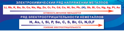 На стенде представлены электрохимический ряд напряжений металлов и ряд электроотрицательности неметаллов. Предназначен для того, чтобы школьники могли использовать его как наглядное пособие и обратиться к нему в любой момент.