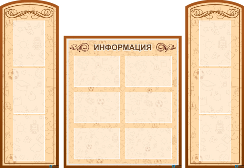 Набор состоит из 3-х резных досок для объявлений или списков. Центральная сопровождается заголовком "Информация". На ней 6 горизонтальных карманов. Боковые стенды без заголовков, каждый с 3-мя вертикальными карманами. Прорези облегчают замену содержимого.
