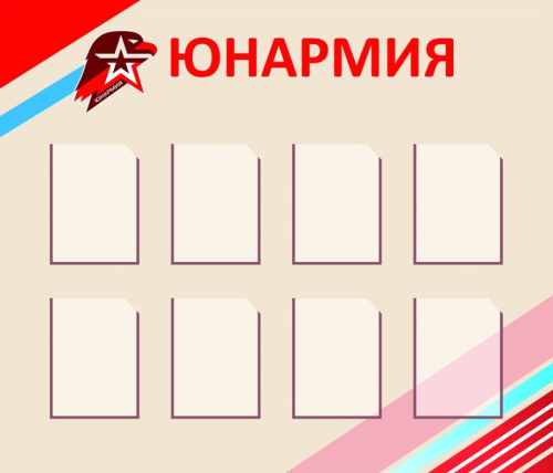 Стенд посвящен военно-патриотическому движению “Юнармия”. Оснащен вертикальными карманами, которые могут использоваться для размещения информации об истории, целях и задачах движения.