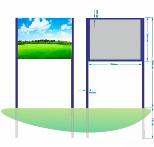 Уличный стенд размещается на территории школы или детского сада. Прямоугольная панель устанавливается на 2 ножки посредством болтовых соединений.