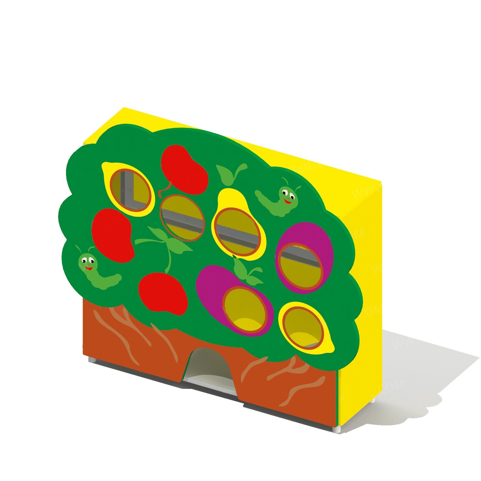 Каркас изготавливается из металла, остальные элементы из влагостойкой фанеры. Художественно оформленный фасад в виде дерева с плодами и гусеницами оснащается прорезями, в которые ребенок бросает мяч. Нижняя часть стенки оборудована специальным вырезом для извлечения мячиков.