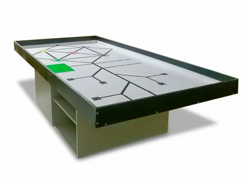 Стол оснащен колесами для удобного перемещения. Для хранения различных учебных материалов предусмотрены ящики под столешницей. Высокие бортики предотвращают падение предметов.