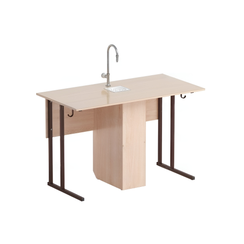 Стол оснащен тумбой под сантехнику, водоразборной колонкой и сливной раковиной. Есть два крючка для сумок и портфелей.