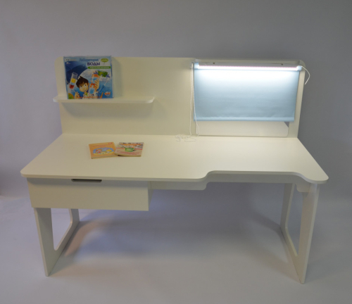 Стол для логопедических занятий оснащен зеркалом с подсветкой и рулонной шторой. Для пособий, инструментов и игр предусмотрены полка и выдвижной ящик.