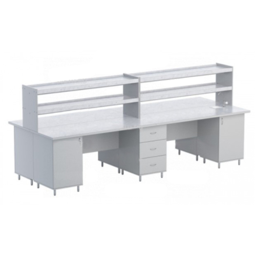 Стол имеет щитовидную конструкцию. Состоит из четырех столешниц, двух надстроек с двумя полками, четырех тумб с распашными дверцами и вкладными полками, двух центральных тумб с выдвижными ящиками и четырех соединительных панелей для тумб. На одной из столешниц размещается лабораторная раковина с краном для холодной воды.