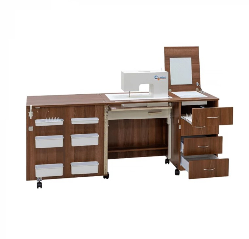 В корпусе 3 выдвижных ящика, сюда можно поместить оверлок. Роликовые опоры дополняются стопорами. Распашная дверца оснащается лотками для принадлежностей.