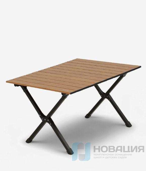 Столешница выполнена из материала, имитирующего дерево, а прочный каркас изготовлен из железа.