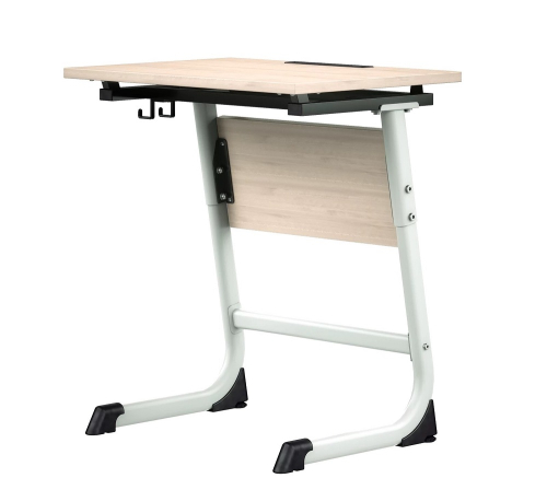 Одноместный стол с изменяемой высотой соответствует СанПиН. Каркас выполнен из плоскоовальной трубы. 2 ножки переходят в полозья с травмобезопасными наконечниками. Неровности пола компенсируются подпятниками. Опоры дополнены перекладиной. Угол наклона столешницы меняется от 0 до 35 градусов дискретно с небольшим шагом (10 положений).