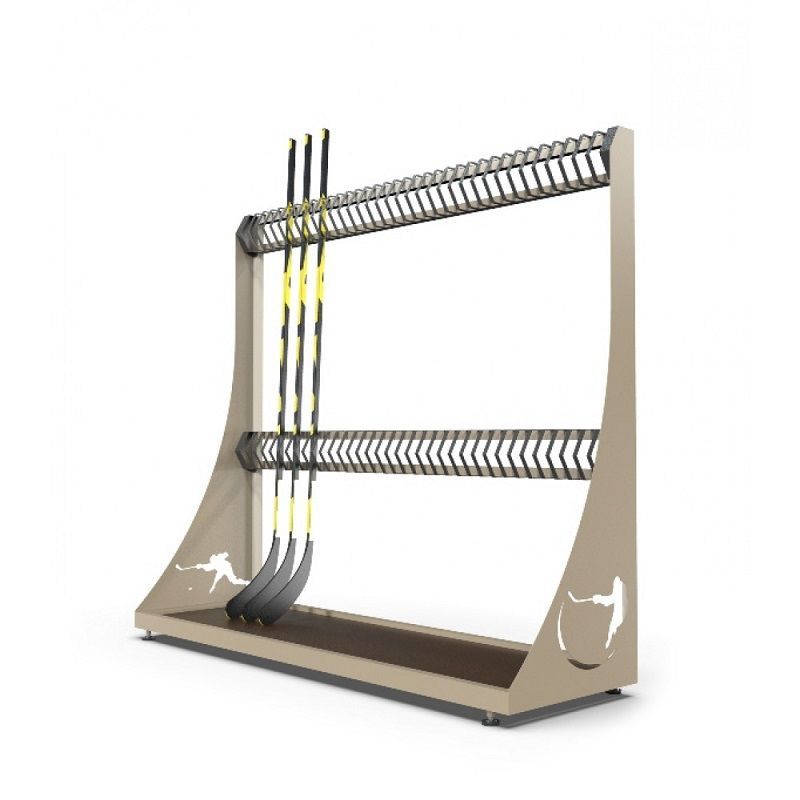 Стойка для хоккейных клюшек размещается в школе. Инвентарь хранится в отдельных ячейках. Основание изготавливается из фанеры. Конструкция покрывается влагостойкой краской. Расстояние между клюшками составляет 1,5 см.