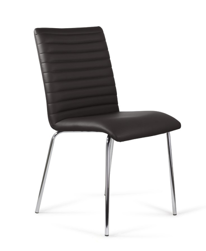 Стул на хромированных ножках оснащен мягким посадочным местом. Высокая спинка и сиденье с изогнутым передним краем равномерно распределяют нагрузку до 120 кг.
