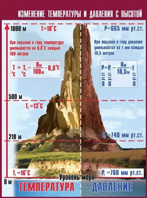 Демонстрационная таблица для кабинета географии оформлена с помощью 1-сторонней полноцветной печати. Плотность листа составляет 440 г/кв.м. На плакате приведена шкала с отметками высоты рельефа над уровнем моря, показаны изменения давления и температуры.