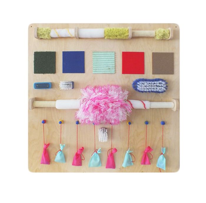 Панель оснащена щётками, мешочками и прочими тактильными элементами. Подходит для игр, построенных на идентификации предметов через прикосновение, способствует активному развитию тактильных навыков и мелкой моторики.