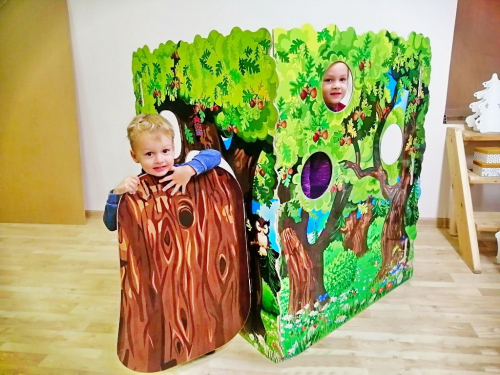 Двусторонняя декорация предназначена для сценических постановок и утренников. На поверхность нанесен цветной рисунок деревьев. В конструкции есть три круглых отверстия и открывающаяся дверца.