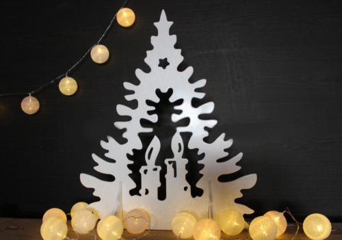 Декорация предназначена для оформления сцены к спектаклям и новогодним праздникам. Выполнена в виде однотонной ели резной формы с контуром свечей внутри. Разборная конструкция состоит из декорации и двух подставок.