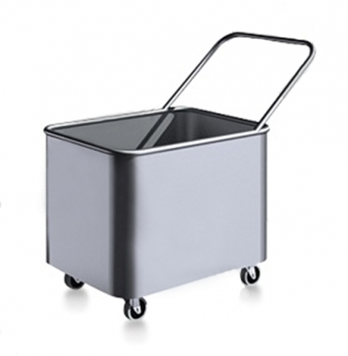 Тележка грузоподъемностью 60 кг позволяет перевозить белье в прачечной. Короб объемом 100 л установлен на 4 поворотных колеса d 75 мм и дополнен ручкой. Все углы конструкции  сглажены.