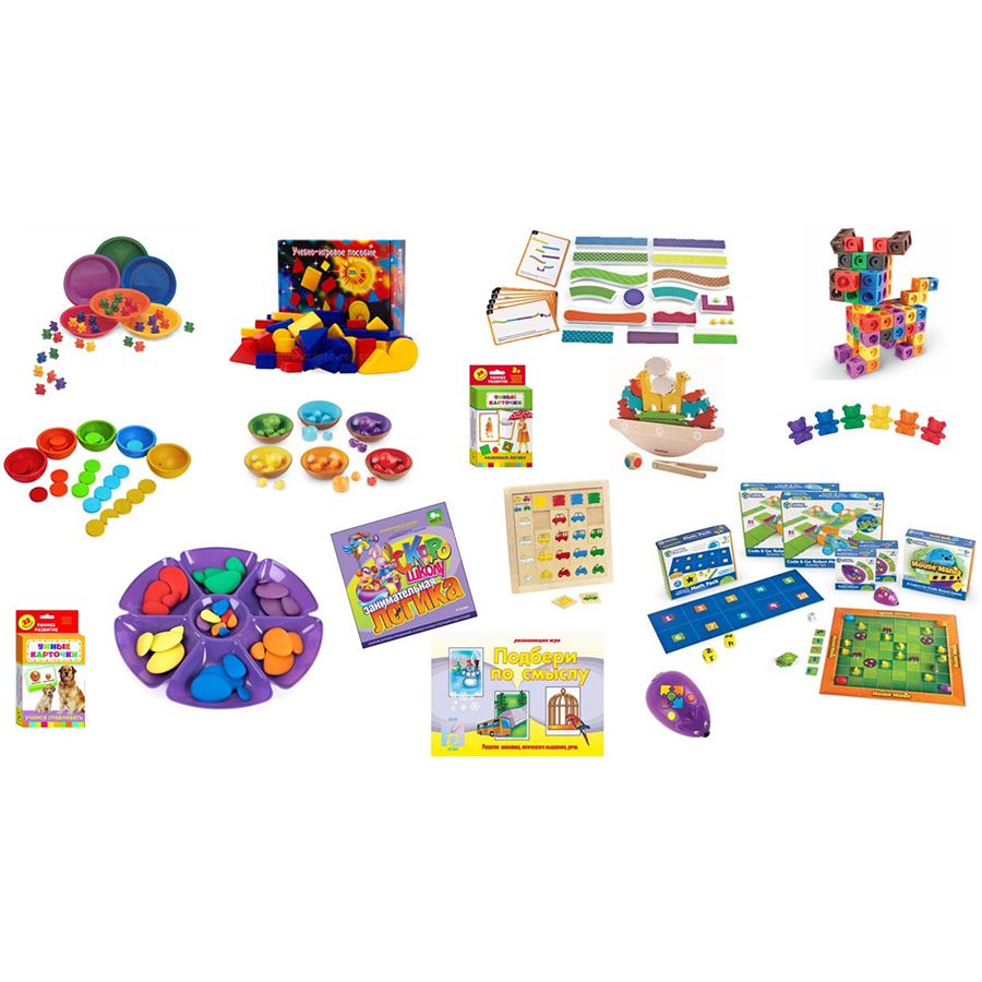 В комплекте: конструктор, наборы для сортировки, рамки-вкладыши, игры, дидактические пособия.