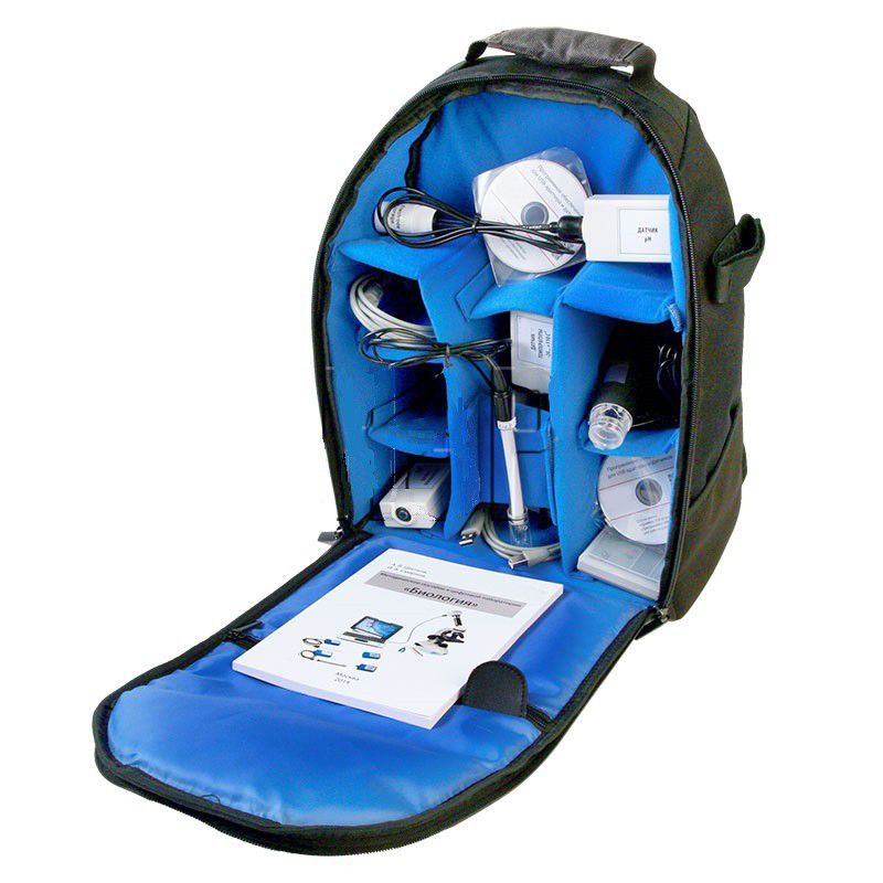 С помощью инструментов и приборов школьник фиксирует параметры окружающей среды, которые влияют на жизнедеятельность растений и живых организмов. Для работы с микропрепаратами предусмотрено специальное оборудование. Все комплектующие укладываются в рюкзак с мягкими отсеками: набор должен быть защищен от ударных и силовых нагрузок.