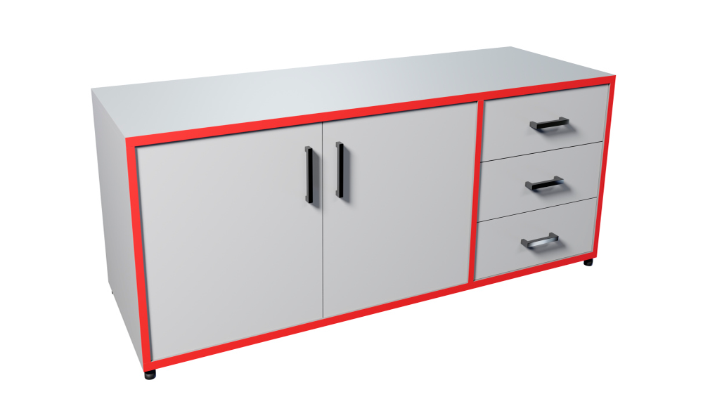 Тумба для проекта "ТР" оснащается 3-мя ящиками на роликовых направляющих (L 350 мм) и 1 съемной полкой, скрытой за распашными фасадами. Дно ящика изготавливается из ХДФ. Ящики и дверцы оснащаются фурнитурой. Изделие поставляется в белом цвете, кромки корпуса на лицевой стороне красные. Возможно изготовление мебели по индивидуальному заказу.