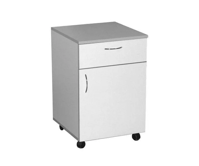 Внутри тумбы хранятся медикаменты и бумажная документация. Кромочная лента ПВХ облицовывает ламинированные панели из ДСП. Изделие поддается обработке дезинфицирующими средствами.