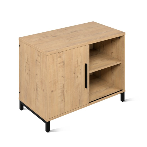Тумба оснащена слайдерной дверью и двумя открытыми полками. Лаконичный дизайн мебели подойдет для любого интерьера.