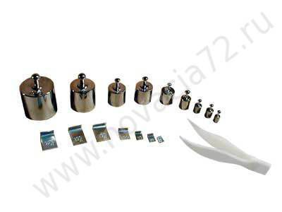 В состав набора входят следующие гири: 100 г - 1 шт., 50 г - 1 шт., 20 г - 2 шт., 10 г - 1 шт., 5 г - 1 шт., 2 г - 2 шт., 1 г - 1 шт., 500 мг - 1 шт., 200 мг - 2 шт., 100 мг - 1 шт., 50 мг - 1 шт., 20 мг - 2 шт., 10 мг - 1 шт.