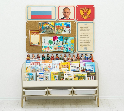 Предназначен для реализации программы патриотического воспитания. Содержит основную символику РФ, панели для размещения работ воспитанников, книги по истории России, ВОВ, русские народные сказки и песни, книги на тему семьи и семейных ценностей, раскраски с тематическими иллюстрациями, настольные игры на тему патриотического воспитания. Соответствует требованиям ФГОС.