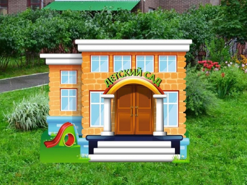 Фигура с цветным изображением изготовлена в виде здания детского сада. На поверхность нанесена пленка для защиты от воздействия внешней среды. Устанавливается посредством металлических стоек и крепежа (входят в комплект).