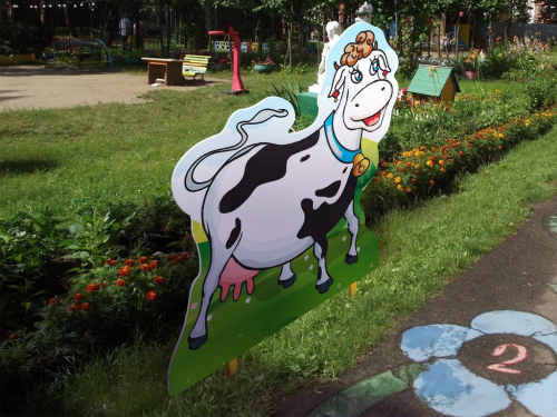 Разноцветная фигура коровы покрыта специальной пленкой, защищающей от выцветания. Для установки конструкции в комплекте предусмотрены металлические стойки и крепеж.