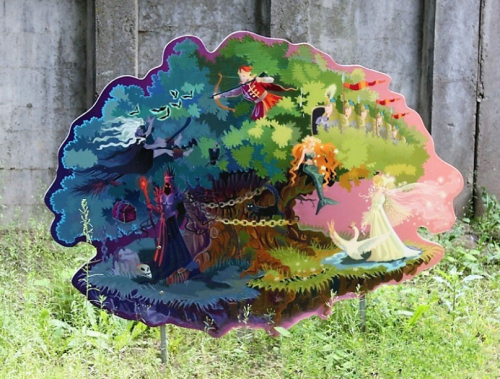 На фигуру нанесена иллюстрация к сказке. Поверхность покрыта специальной пленкой для защиты рисунка от выцветания. Для установки конструкции в комплекте предусмотрены металлические стойки и крепеж.