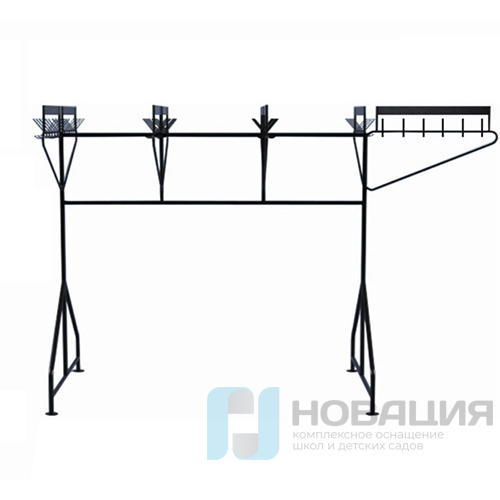 Напольная вешалка для верхней одежды оснащена поворотными кронштейнами. Каркас изготовлен из холоднокатаной электросварной трубы, покрыт порошковой эмалью, все торцы закрыты пластиковыми заглушками.