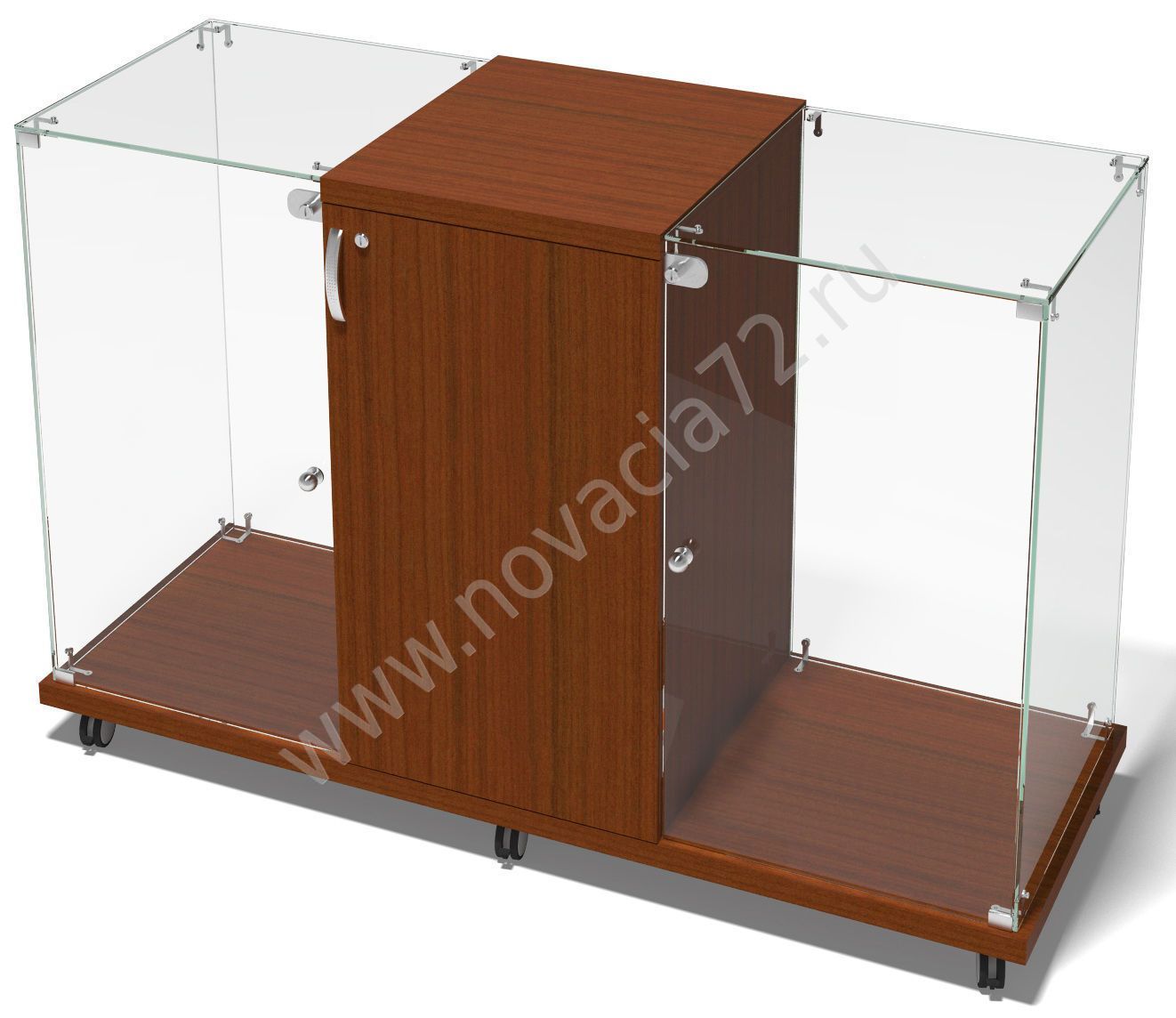 Витрина делится на 3 секции: центральная из ЛДСП, 2 боковые стеклянные (марка М1). Все отсеки оснащены дверцами с замками.