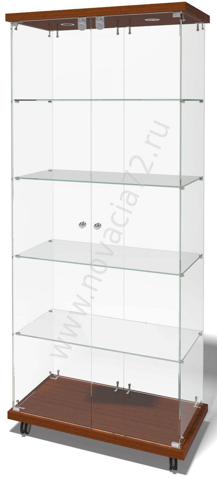 Витрина оснащена 2-мя дверцами с замками, а также 2-мя точечными светильниками. Основание и фриз выполнены из ЛДСП, а боковые стенки, распашные створки и 4 полки-из стекла марки М1.
