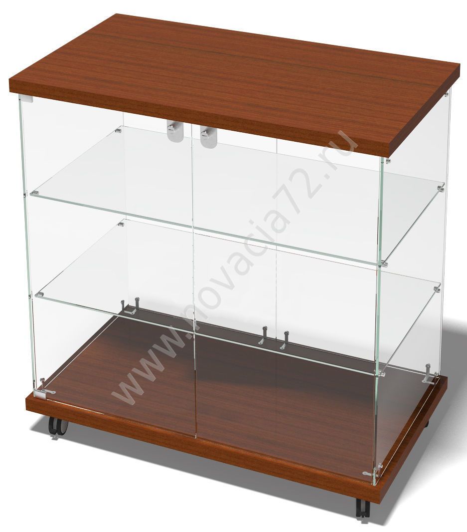 Демонстрационная витрина прямоугольной формы представлена крышкой и нижней панелью из ЛДСП. Стенки, 2 пары дверц и 2 полки выполнены из стекла марки М1.