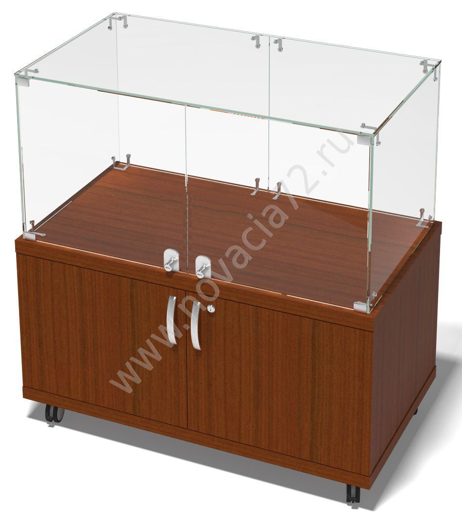 Конструкция витрины представлена стеклянным отделением (марка материала М1) и тумбой из ЛДСП. Обе части дополнены двухстворчатыми дверками, которые запираются на замок.