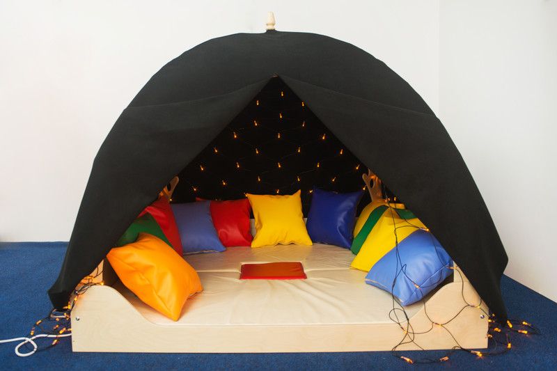 Шатер для релаксации устанавливается в сенсорной комнате детского сада. Лампочки, мерцающие под тканевым куполом, удобное мягкое основание, разноцветные напольные подушки создают атмосферу уюта. Каркас выполнен из тщательно обработанной фанеры российского производства, не имеет острых углов. Гладкие поверхности покрыты гипоаллергенным лаком (производство — Германия). Все материалы нетоксичны.