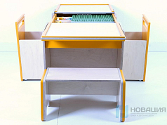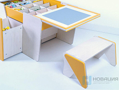 Стол предназначен для работы с конструкторами. Высокие бортики с закругленными углами предотвращают падение мелких деталей. Под столешницей расположены открытые полки для хранения, в нижней части конструкции - ящик с дверцей.