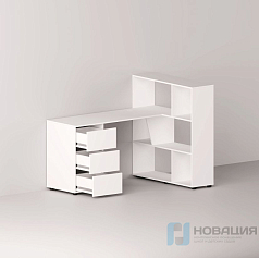Встроенный стеллаж добавляет дополнительную полезную площадь, предполагая аккуратное размещение книг, документов и аксессуаров. Элегантный дизайн подчеркивает современность интерьера, превращая рабочее место в функциональный и стильный элемент обстановки.